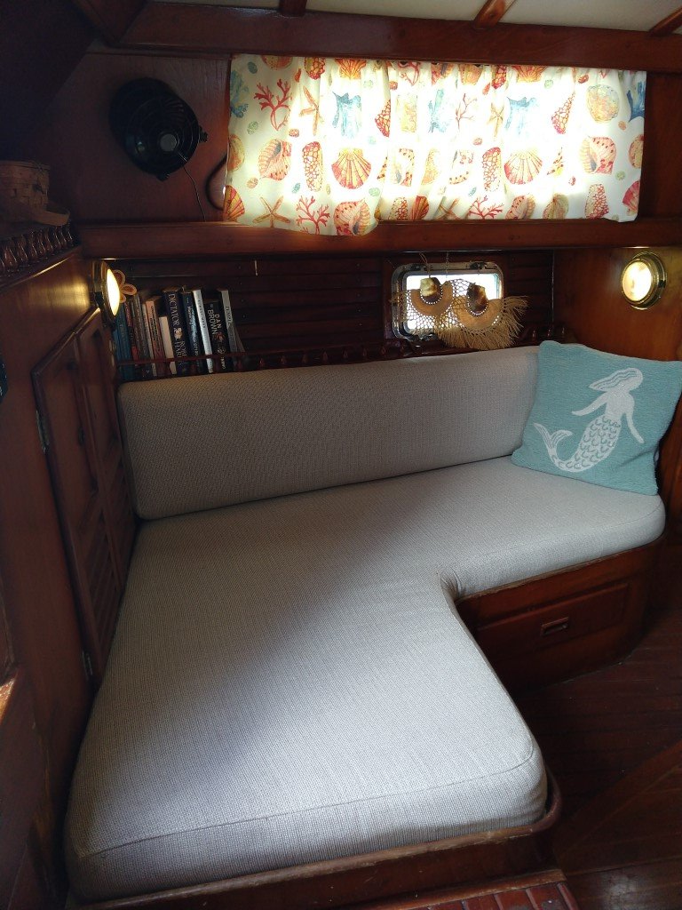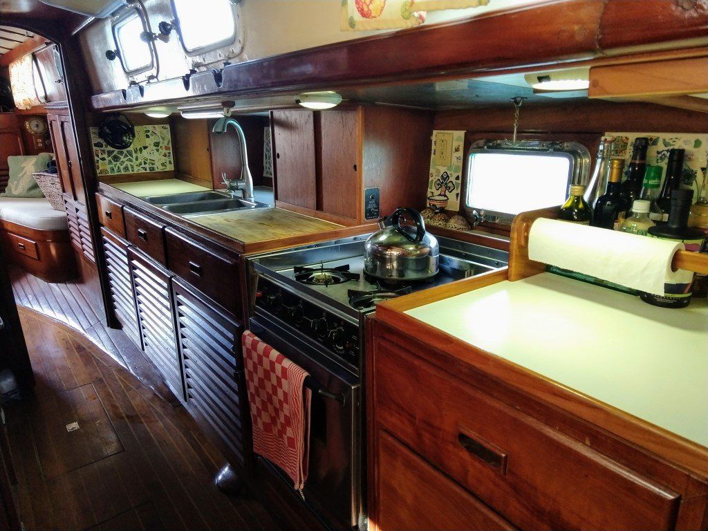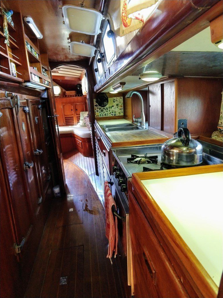 Mermaid is an Aleutian 51 cutter rigged sloop built in Taiwan in 1976. She’s a veteran cruiser with tens of thousands of blue water miles under the keel. She is very sturdy and heavy with a thick fiberglass hull and long, deep keel providing a comfortable ride. Her unique design has a center cockpit with the steering and navigation stations covered by a hard dodger and stratoglass that can be rolled down to keep out the rain as well as a small, aft cockpit with storage under the settees, a swim step and shower that is ideal for taking a dip at anchor or hauling in a fish.
