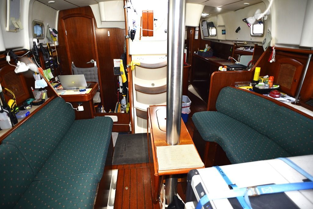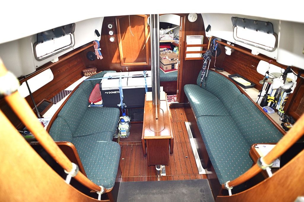 The saloon is the heart of the Beneteau 36CC, with a U-shaped settee and a large dining table that can comfortably accommodate guests.