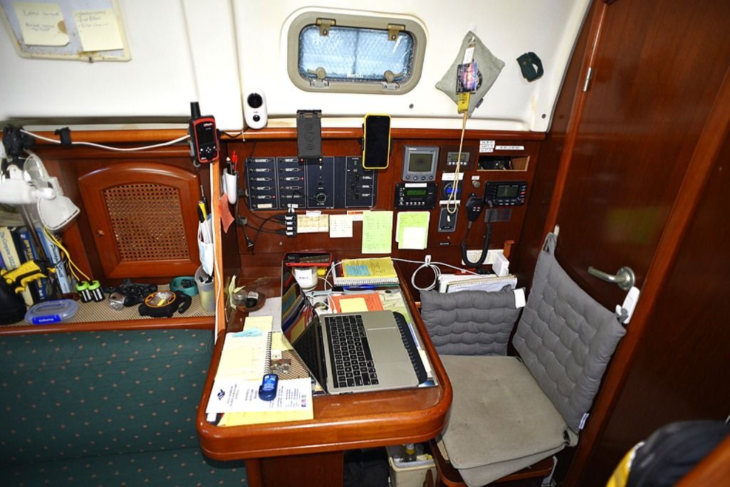 The helm station is well-appointed with modern navigation instruments, a comfortable helm seat, and excellent visibility. The ergonomically designed layout ensures that all controls are easily accessible, enhancing the overall sailing experience.