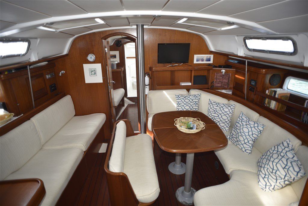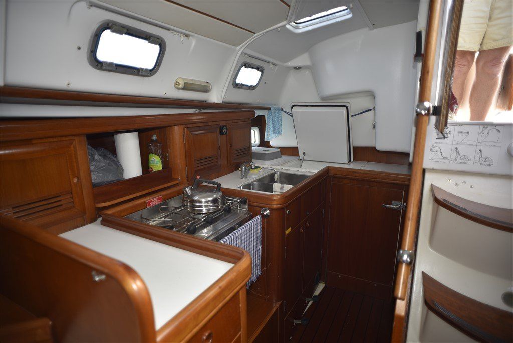 The Beneteau 411, designed by the renowned Groupe Finot, exemplifies a true marriage of performance and beauty. With the bulb / fin keel, maximum stability and efficiency on all points of sail are achieved by her low center of gravity. The standard in-mast furling main and roller furling genoa provide efficiency and true ease of handling. The large cockpit with teak inlay seats is designed for maximum comfort and the pedestal console allows ample space to install electronics. There is also a dual-leaf cockpit table containing a large molded storage area and plenty of space to stow gear in the large cockpit lockers. The extra-wide aft swim platform and ladder, walk-through transom, and standard cockpit shower makes swimming easy and convenient. Both the two- and three-cabin layouts have roomy companionways, large cabins, and plenty of storage throughout, all accented with richly detailed cabinetry. Specially designed for serious cruising, the 411 nav station has a large chart table with additional locker storage underneath, as well as ample space for installing electronics. The deluxe forward owner's stateroom features a generous double berth and an upholstered port settee that is perfect for reading or relaxing. There is also private access to the spacious forward head with sink and shower unit. The galley is beautifully appointed with pressure laminate countertops, double stainless sinks, and loads of storage. The two-compartment refrigerator / freezer has top and side access, and the two-burner propane stove with oven will accommodate every culinary need.