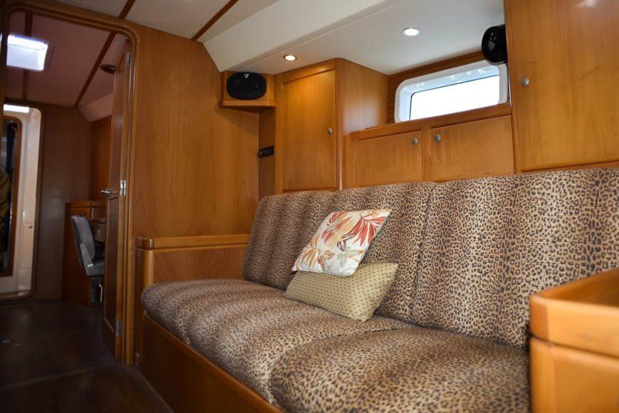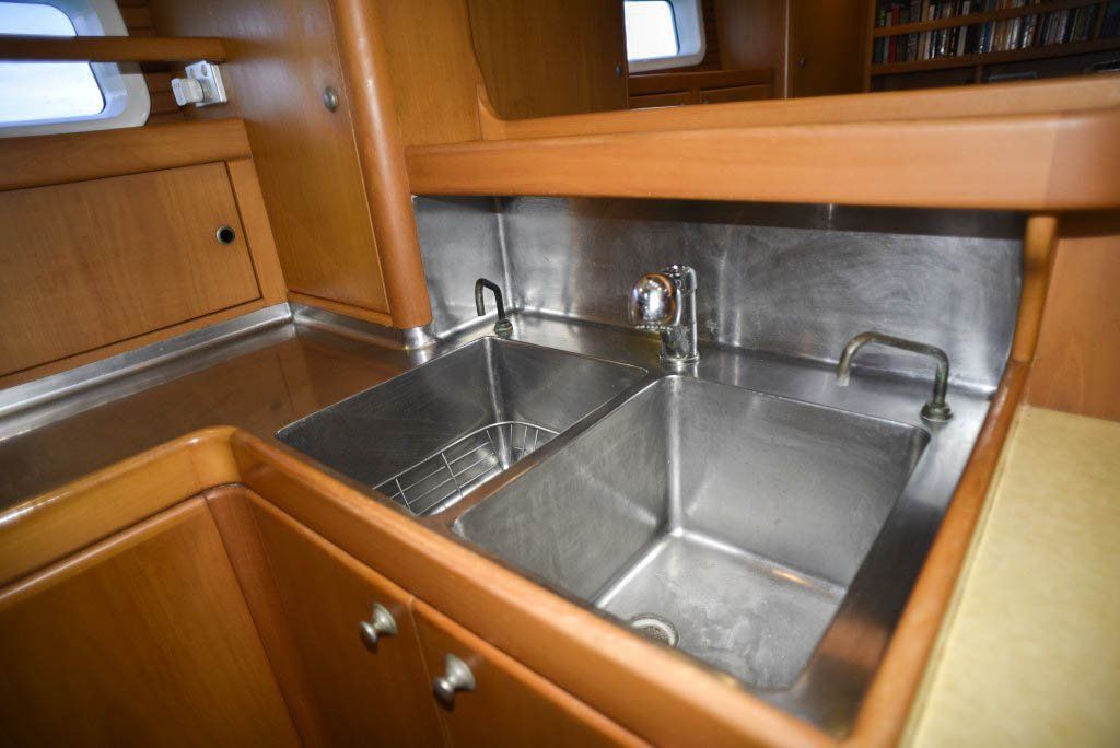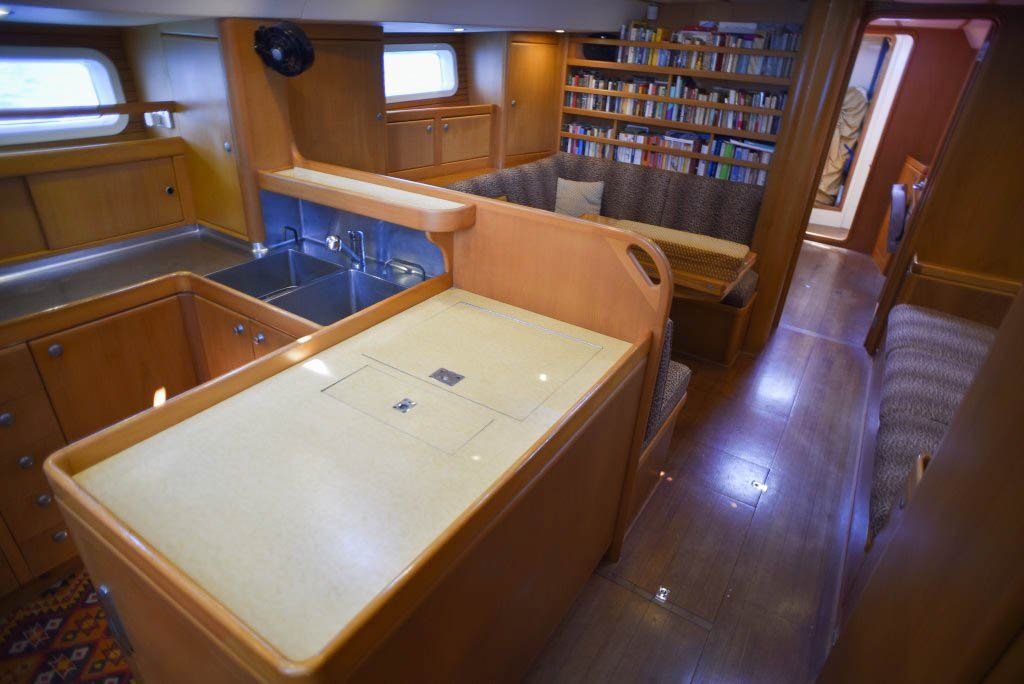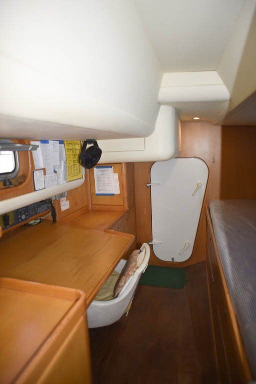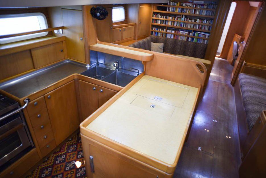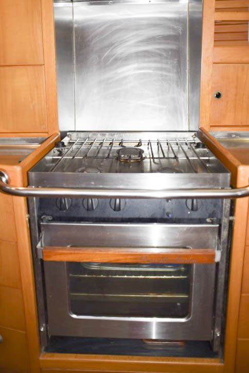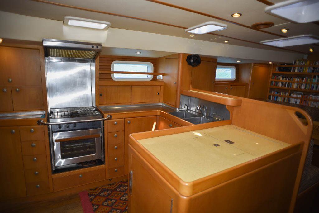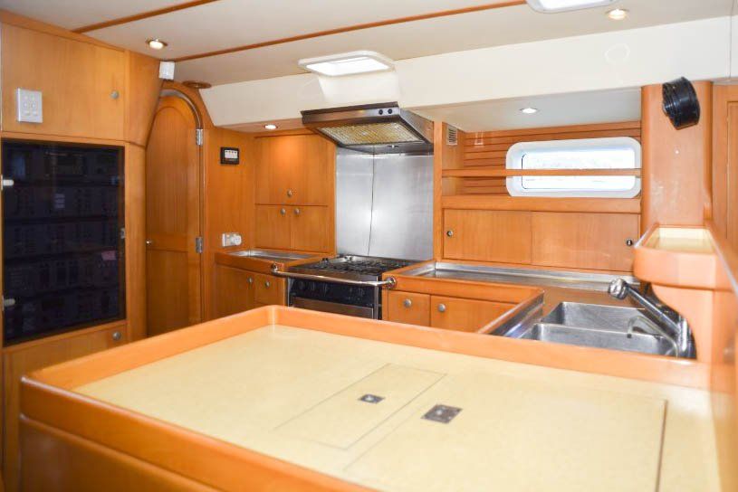The well equipped u-shaped galley is immediately to port at the bottom of the companion way. Generous storage in multiple cabinets and drawers. Custom all-in-one moulded sink and draining rack and counter space. Large front opening fridge with separate freezer. There is a three burner hob and oven with extractor hood above. The galley is fully equipped and ready to leave the dock for instant live aboard and offshore cruising.