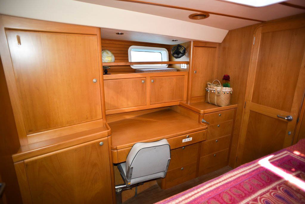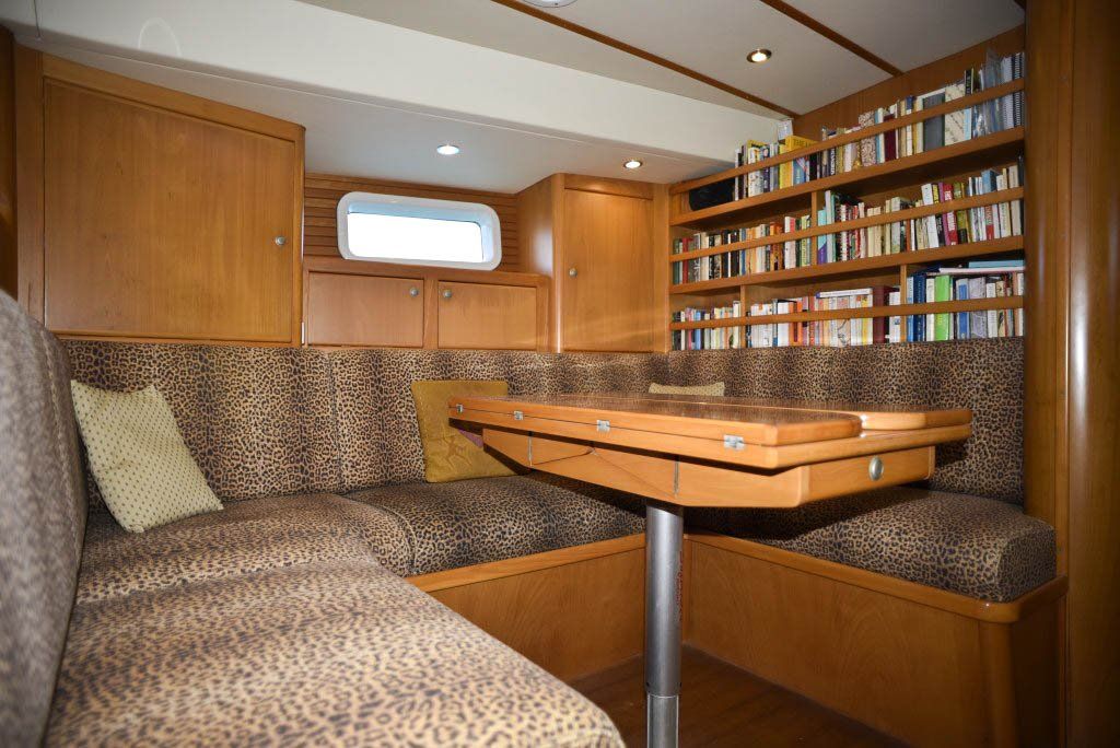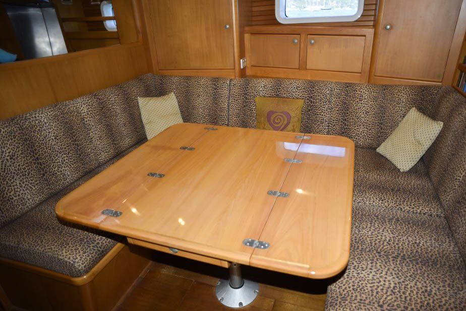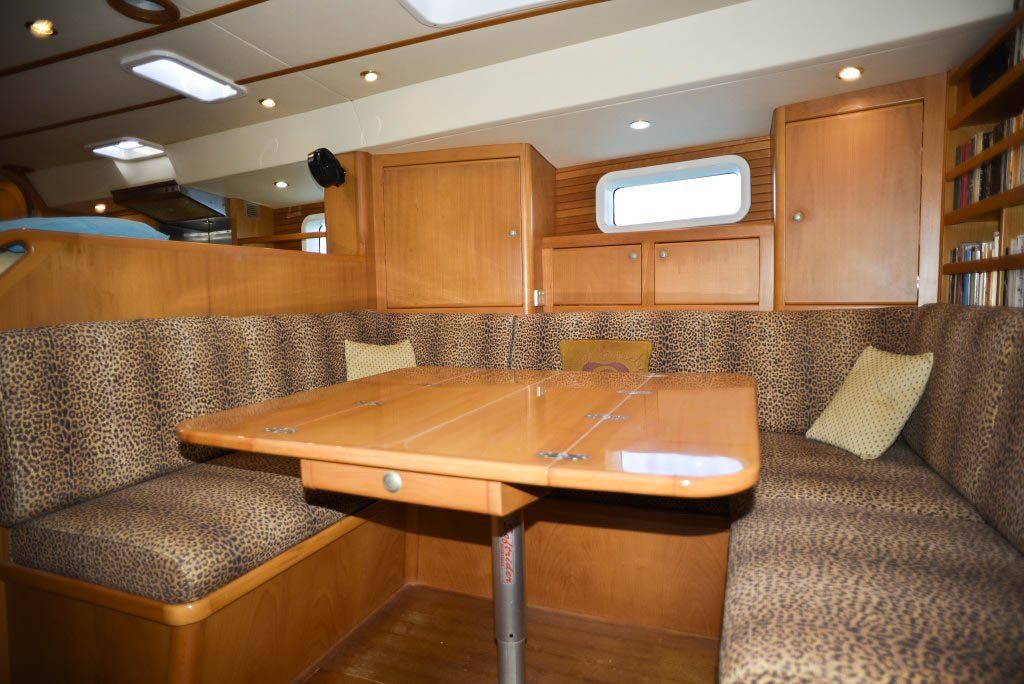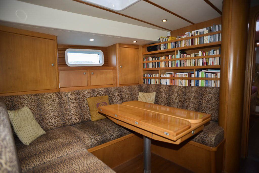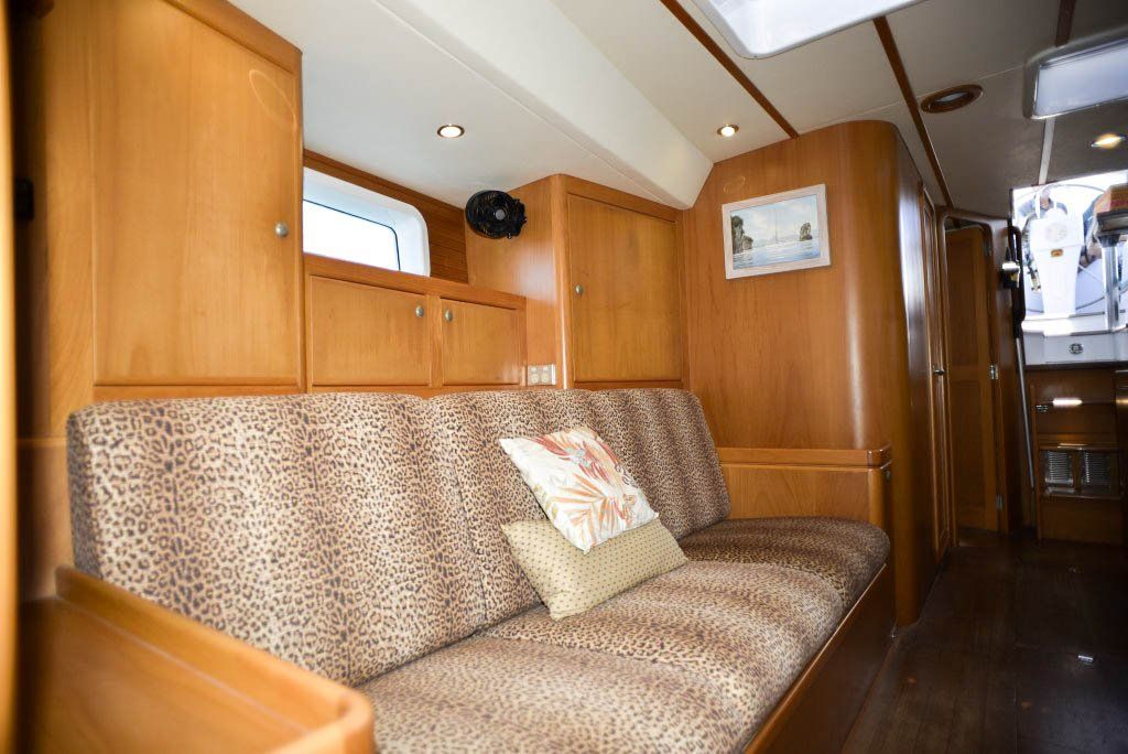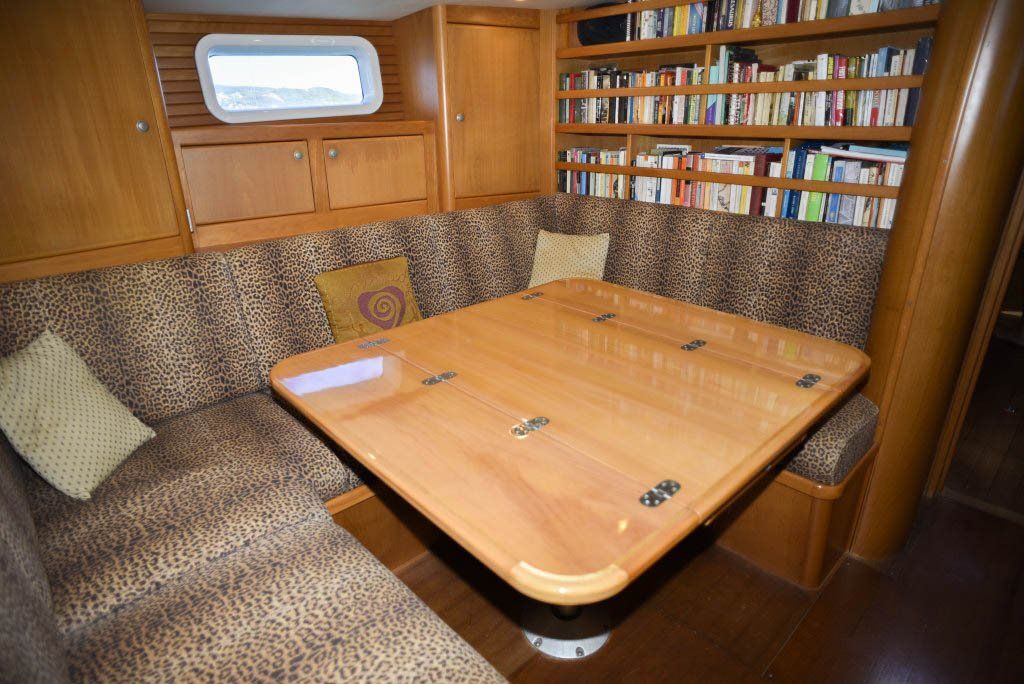 The saloon is well-ventilated and extremely light and bright. Ample storage can be found under the seats and in the cabinets above. The folding table is constructed from European Beech with a beautiful Silver Ash inlay.