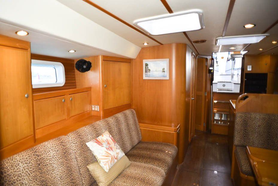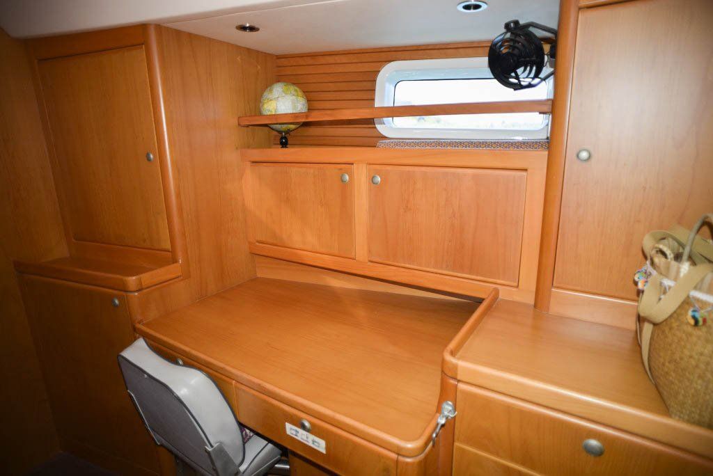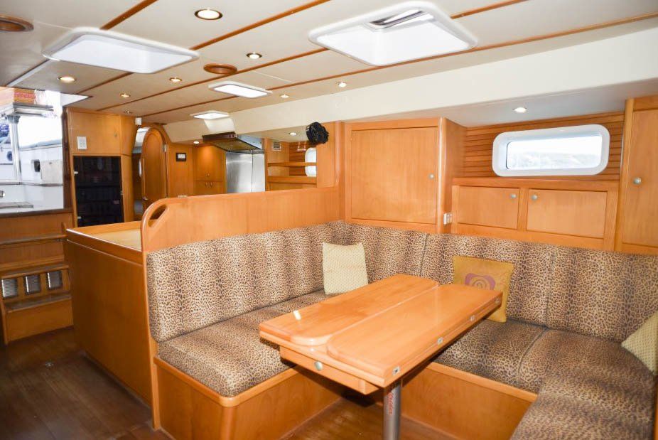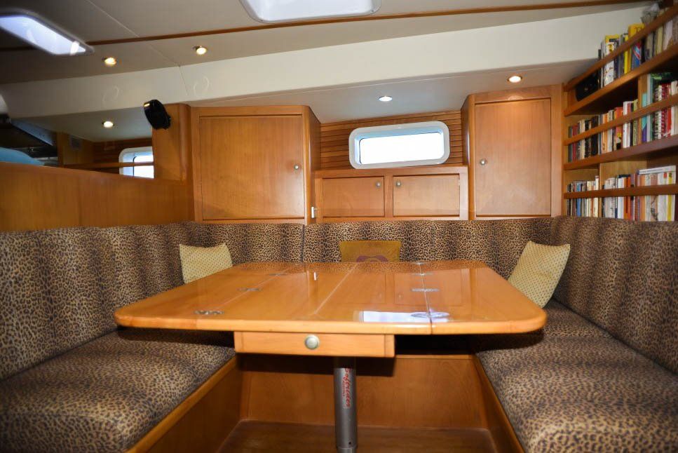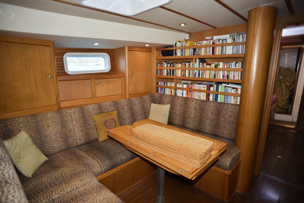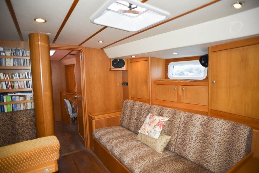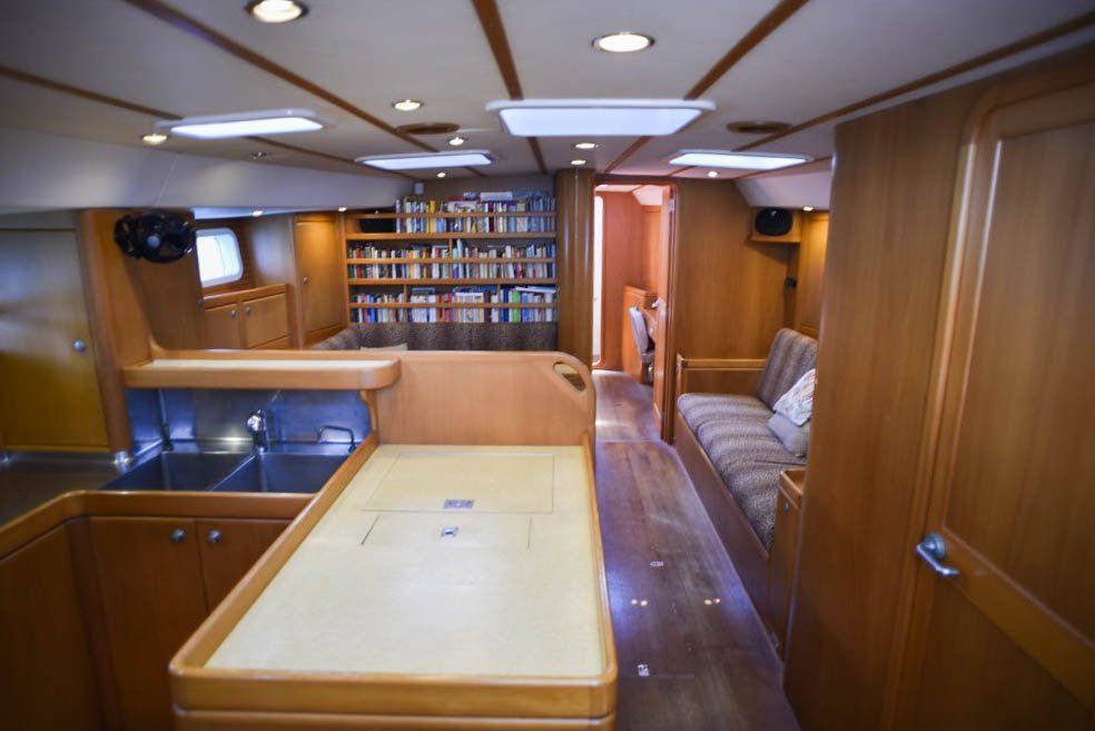The saloon is well-ventilated and extremely light and bright. Ample storage can be found under the seats and in the cabinets above. The folding table is constructed from European Beech with a beautiful Silver Ash inlay.