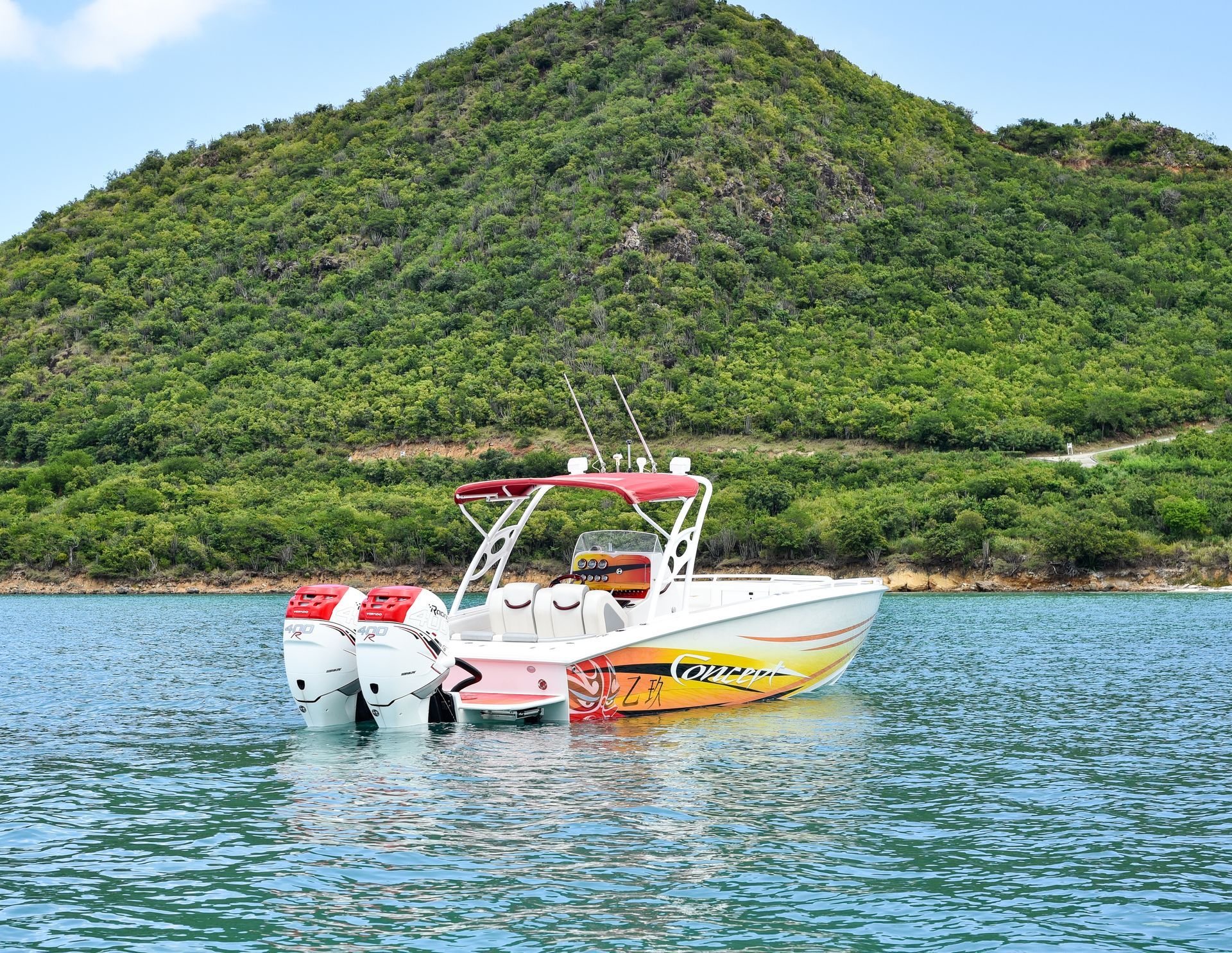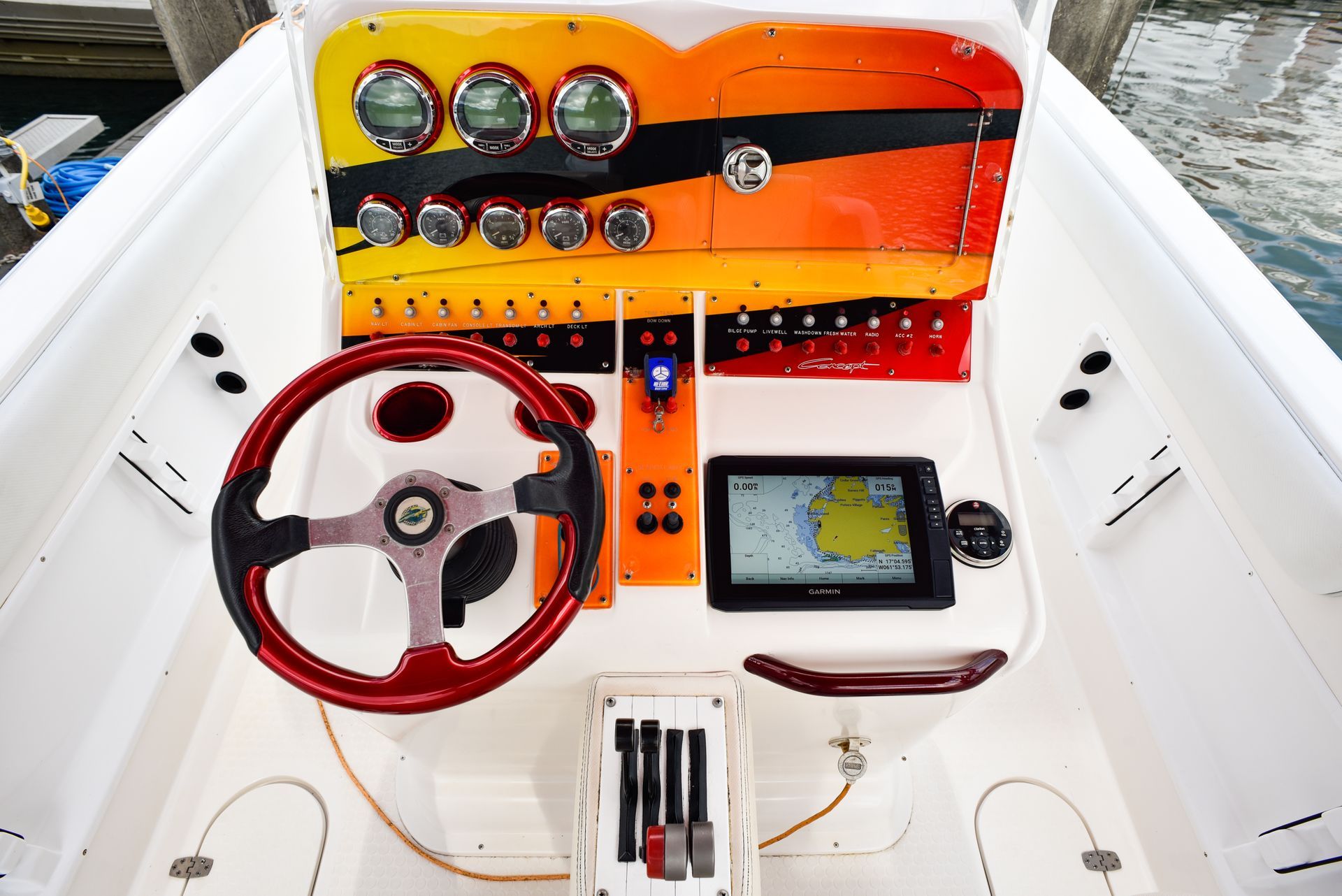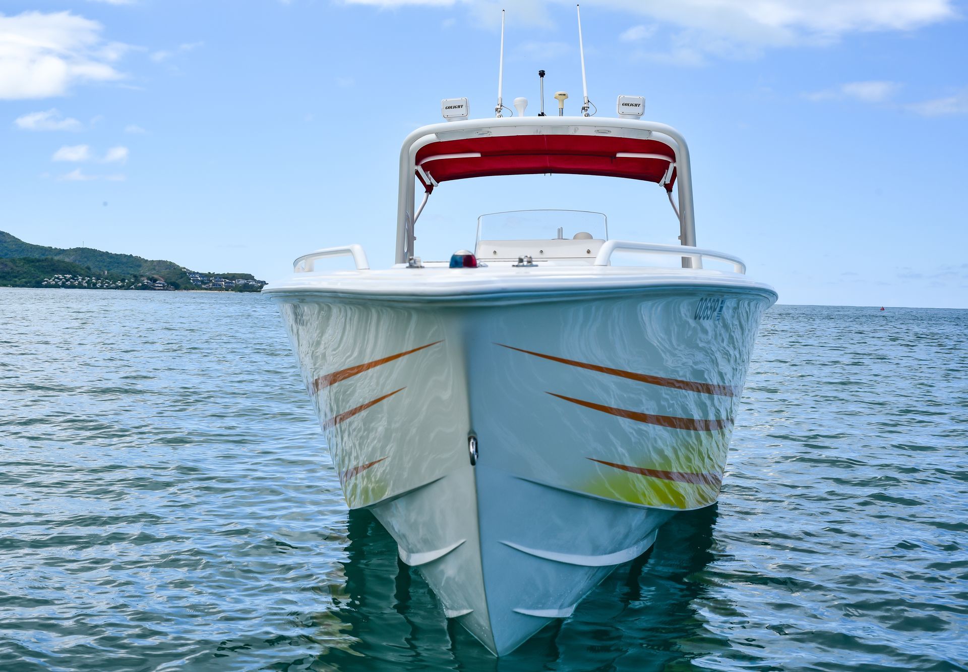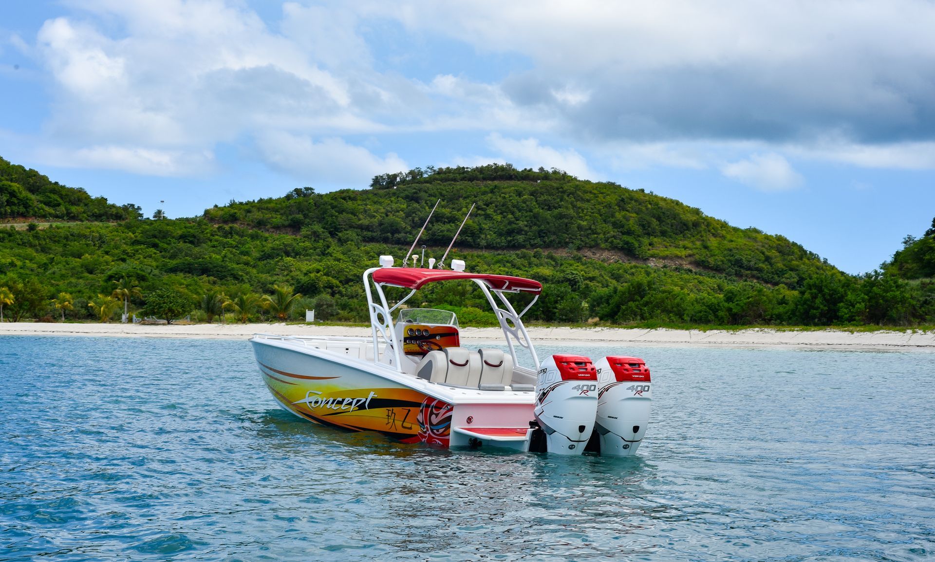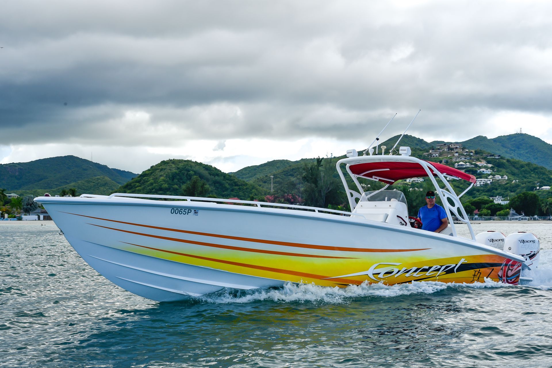 This 2006 Concept 36 is a high-performance Center Console designed for speed and comfort. Equipped with twin Mercury Verado I-6 350hp engines, each with just 310 hours, this boat can reach speeds as high as 69 mph. The owner replaced the original 350hp decals with 400hp stickers for a bolder/more aggressive look.