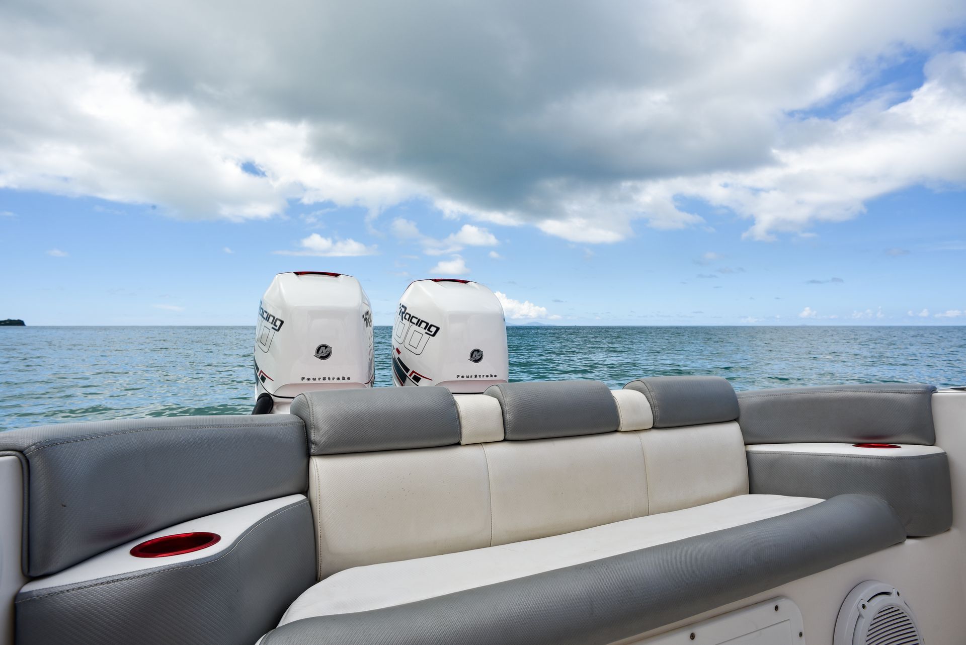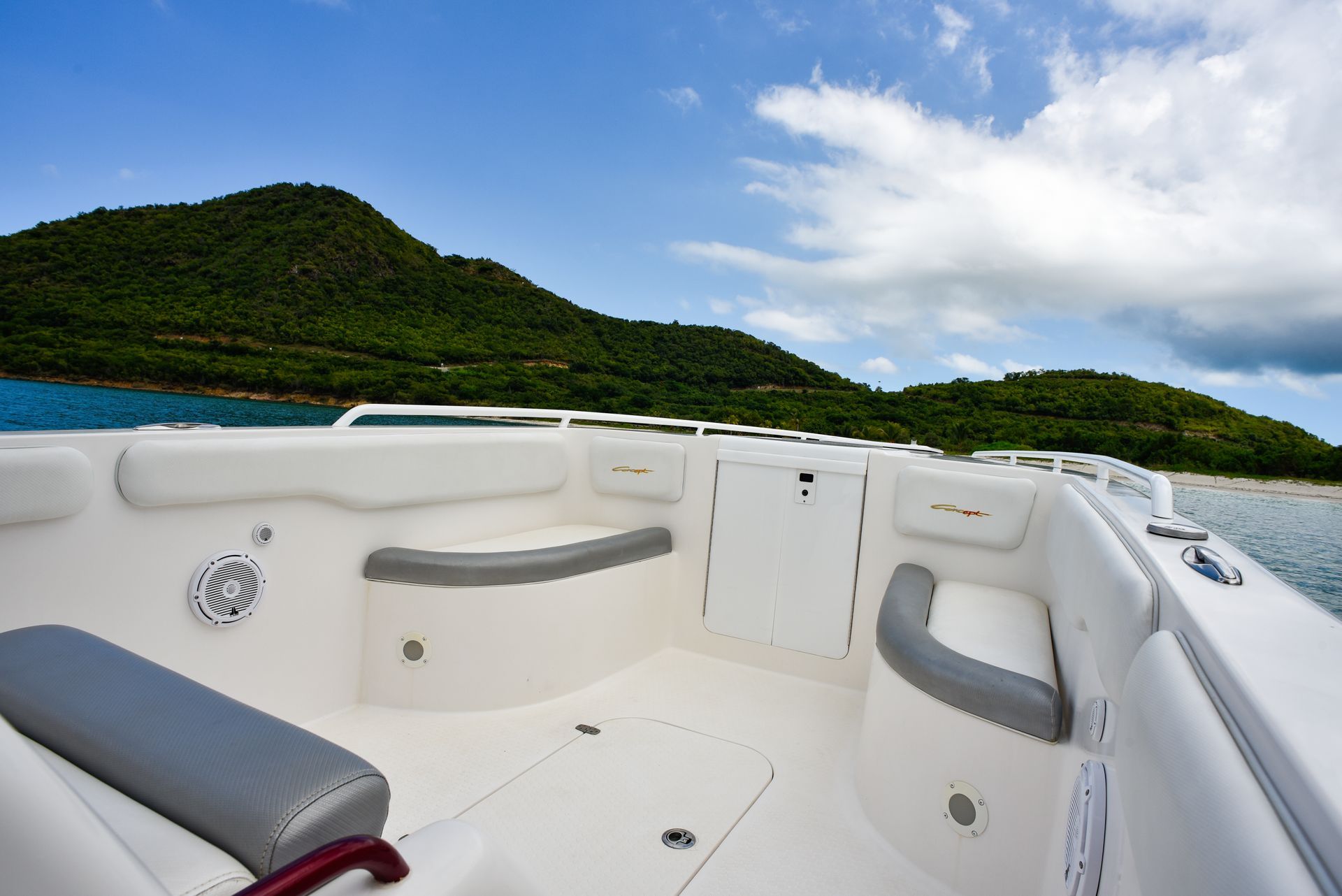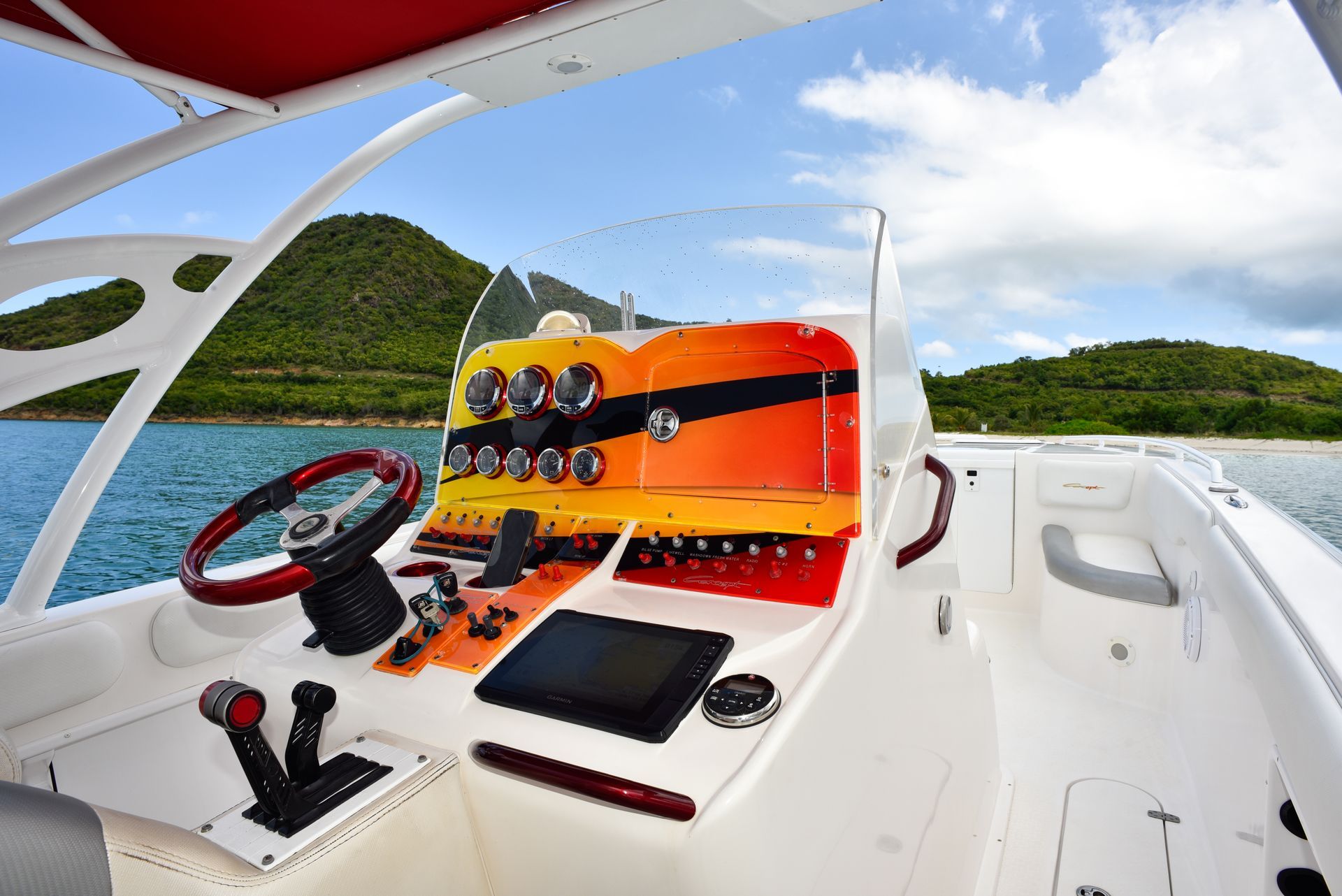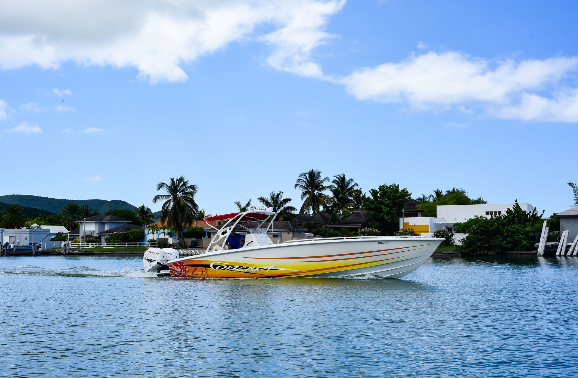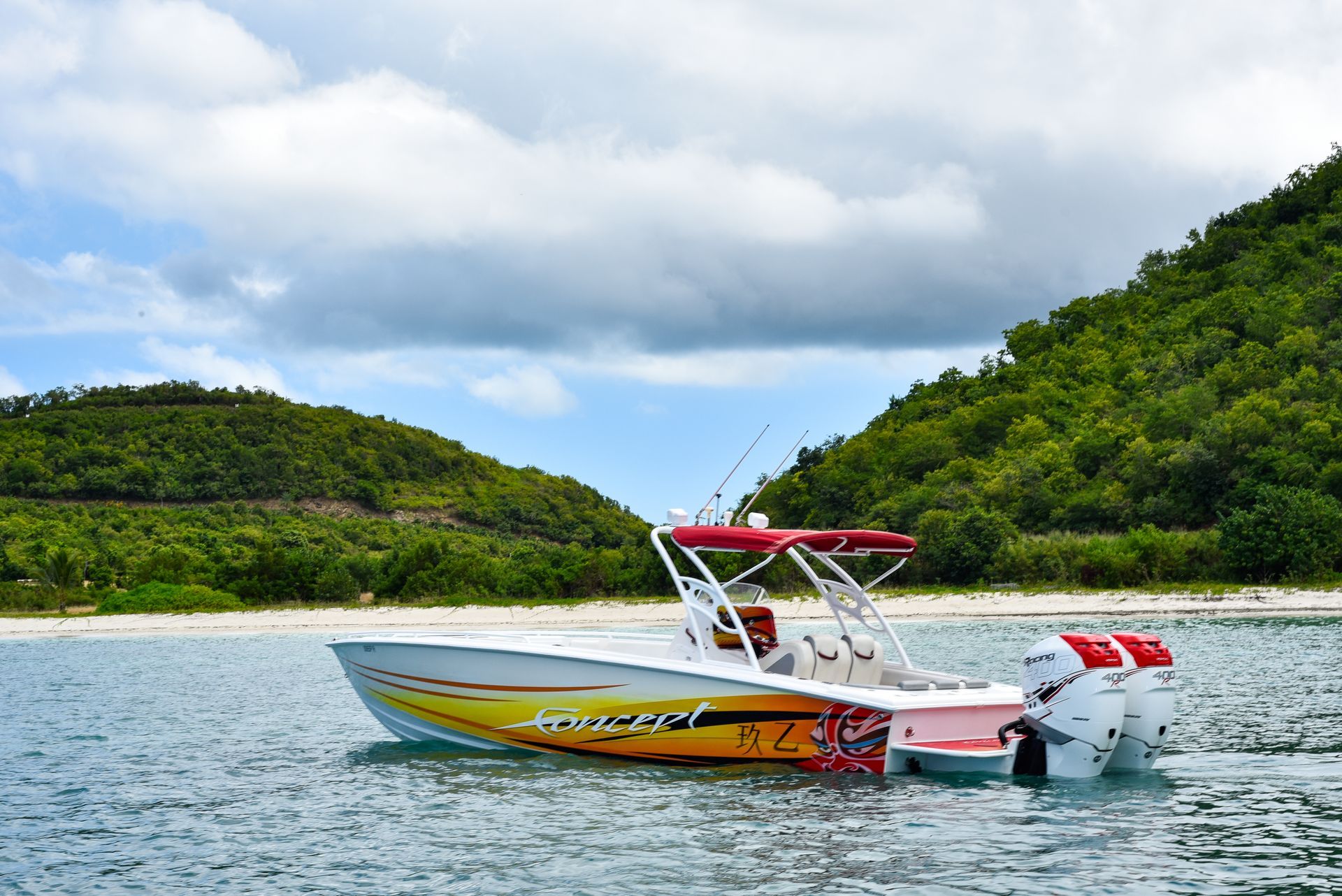 This 2006 Concept 36 is a high-performance Center Console designed for speed and comfort. Equipped with twin Mercury Verado I-6 350hp engines, each with just 310 hours, this boat can reach speeds as high as 69 mph. The owner replaced the original 350hp decals with 400hp stickers for a bolder/more aggressive look.