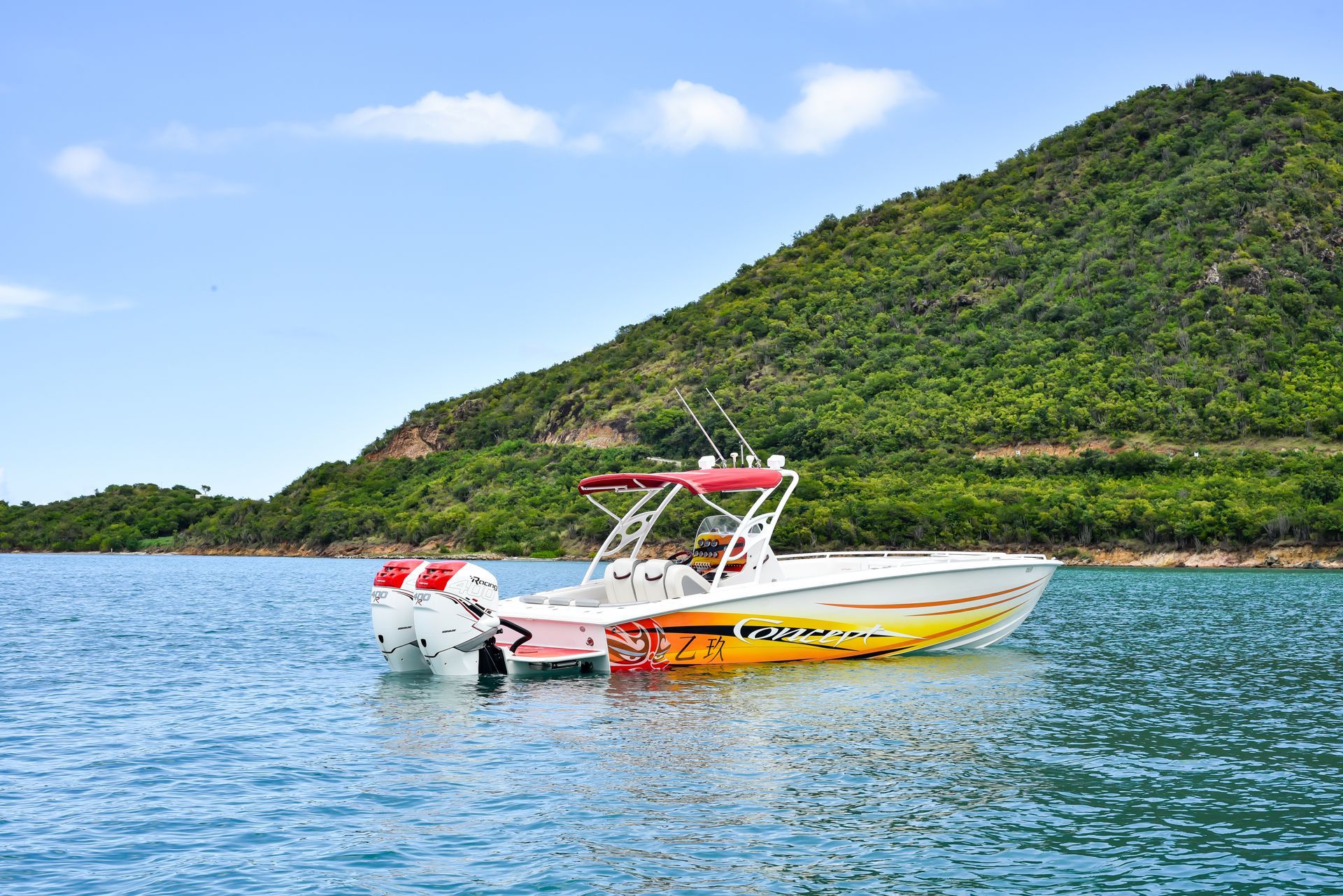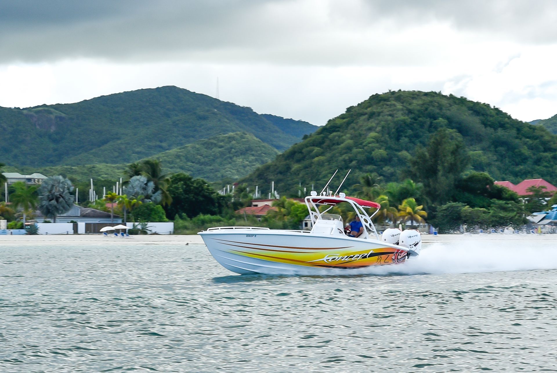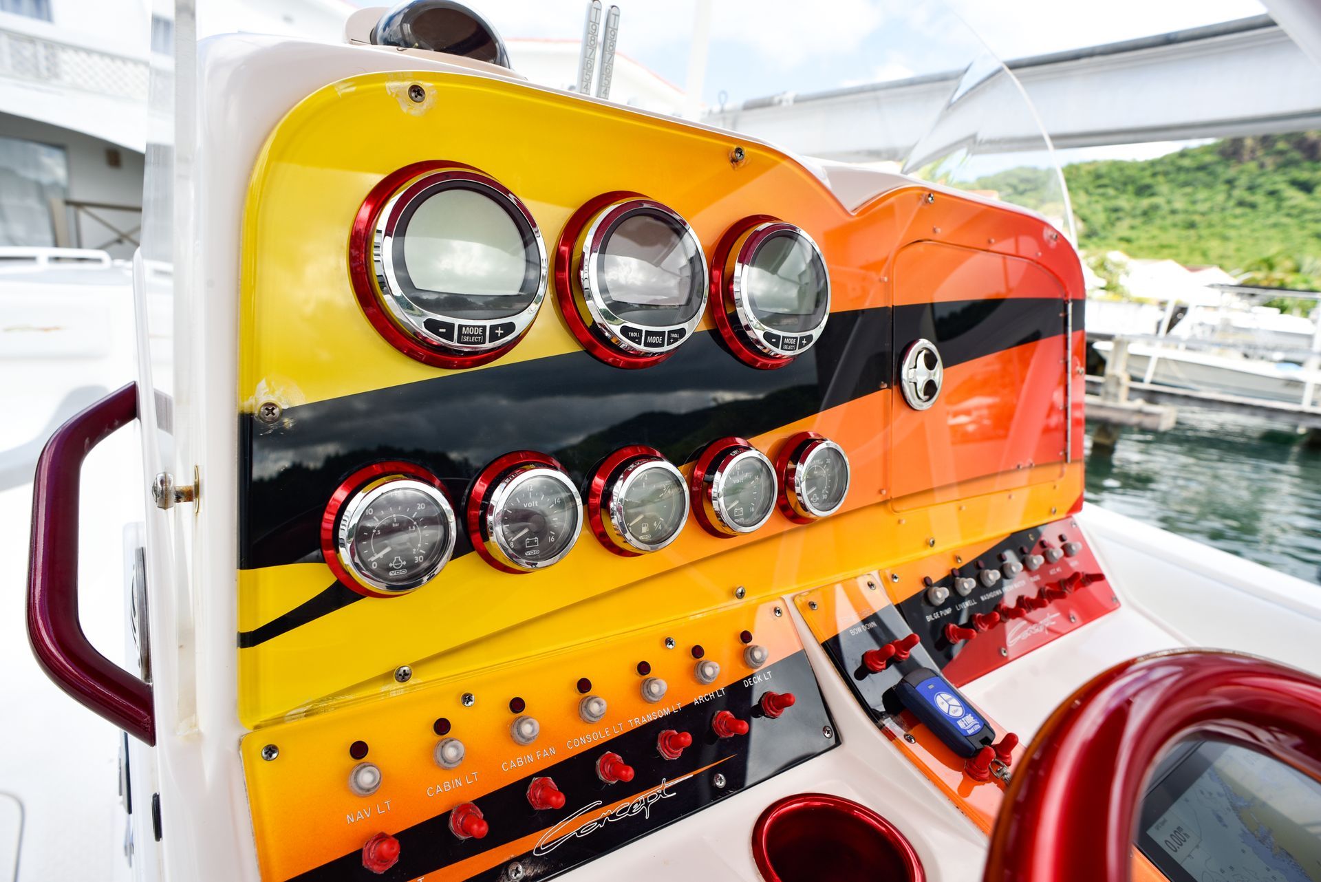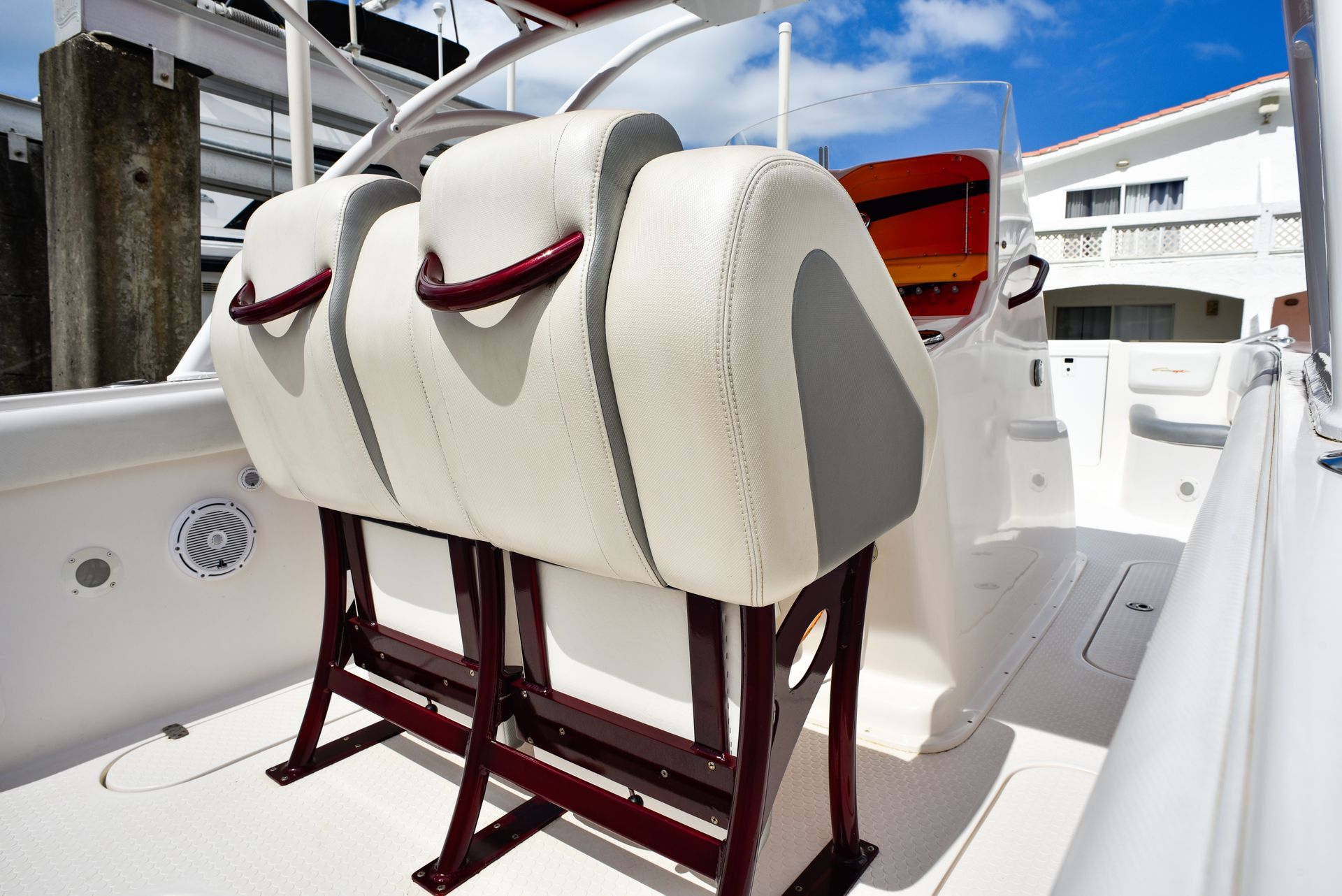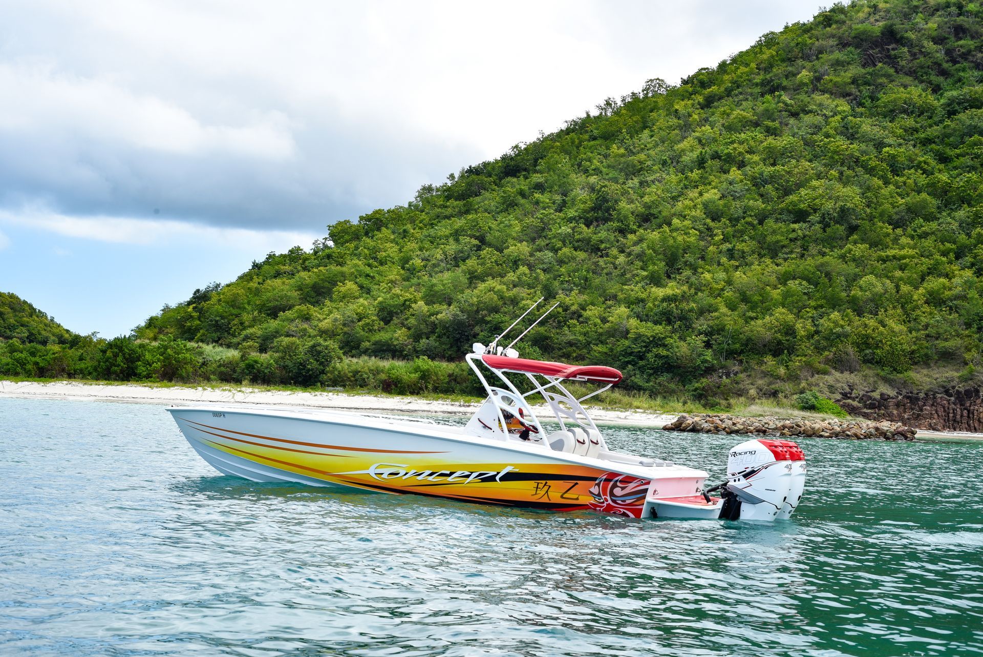 This 2006 Concept 36 is a high-performance Center Console designed for speed and comfort. Equipped with twin Mercury Verado I-6 350hp engines, each with just 310 hours, this boat can reach speeds as high as 69 mph. The owner replaced the original 350hp decals with 400hp stickers for a bolder/more aggressive look.