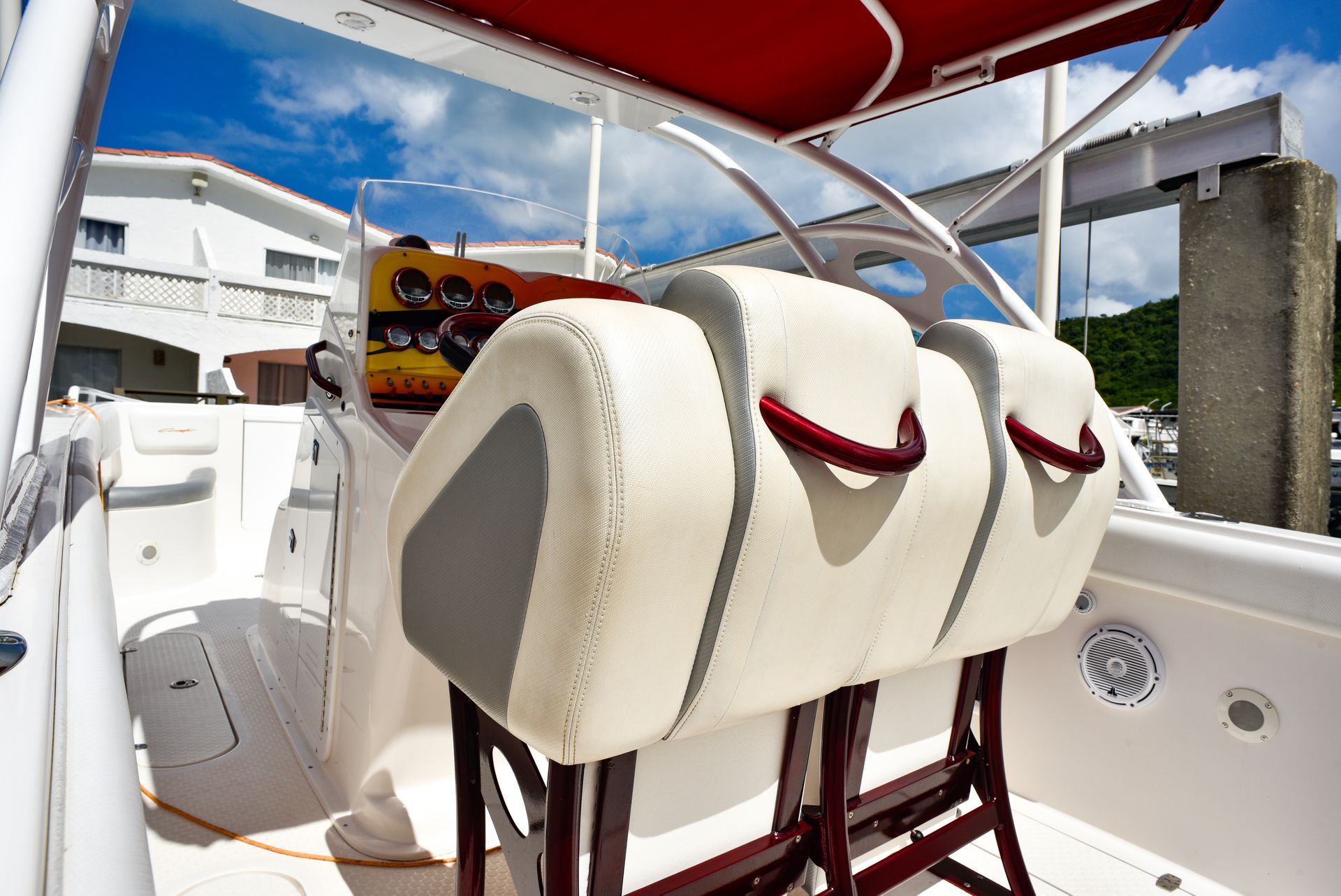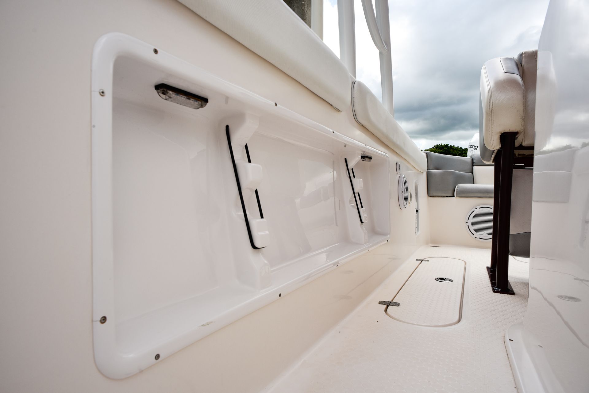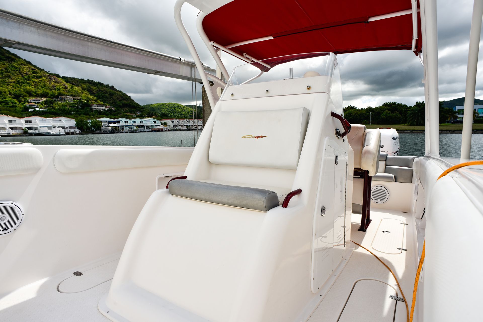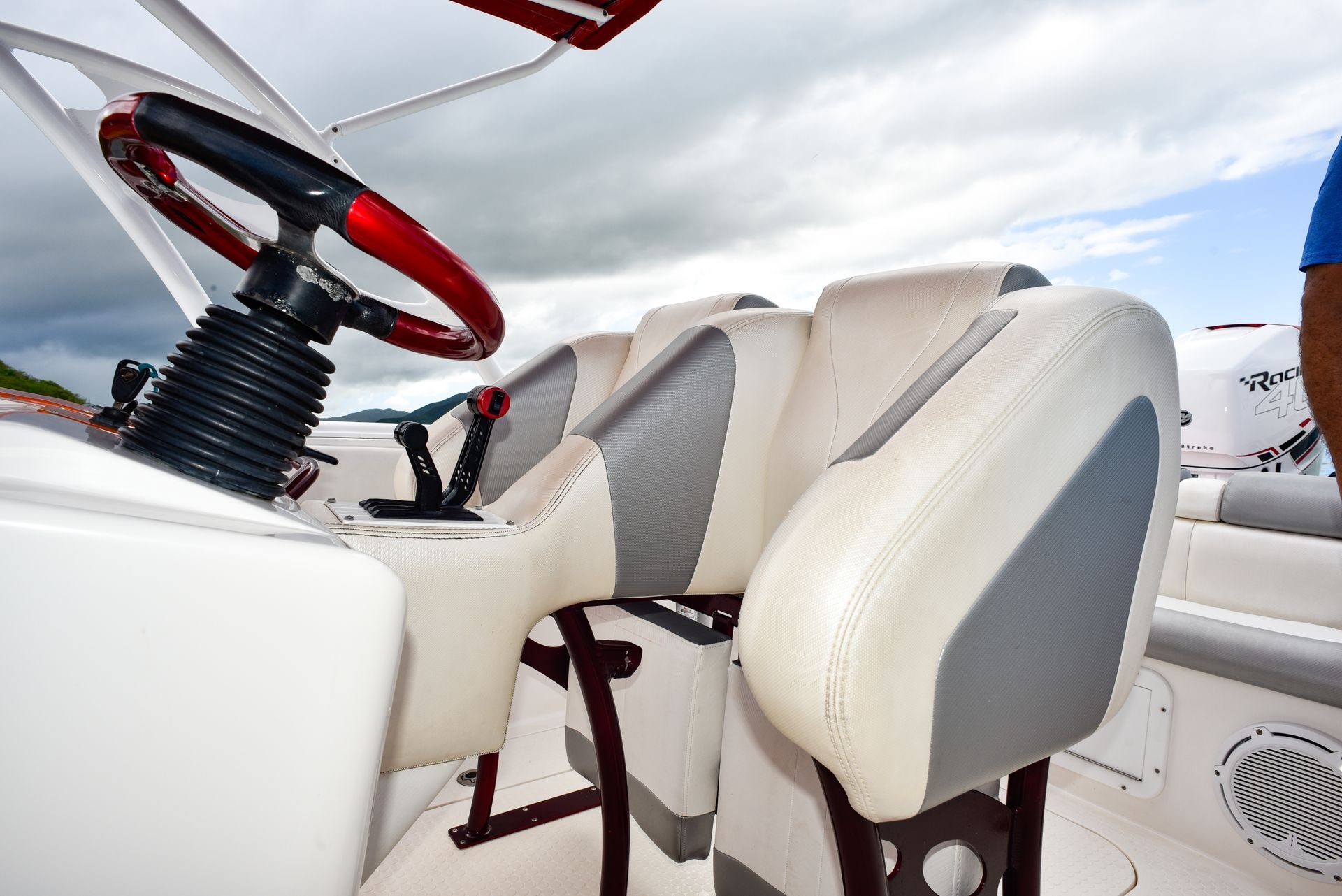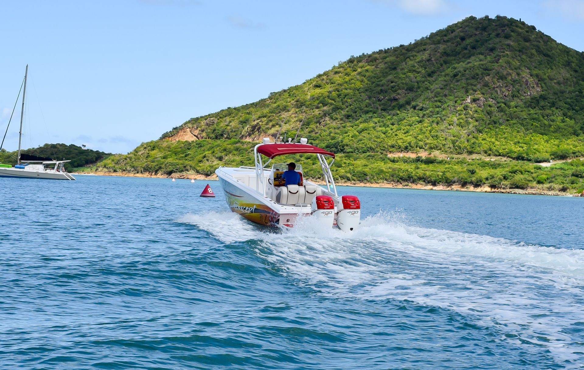 This 2006 Concept 36 is a high-performance Center Console designed for speed and comfort. Equipped with twin Mercury Verado I-6 350hp engines, each with just 310 hours, this boat can reach speeds as high as 69 mph. The owner replaced the original 350hp decals with 400hp stickers for a bolder/more aggressive look.